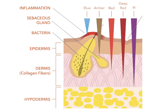 Each wavelength penetrates to different depths and triggers specific cellular responses