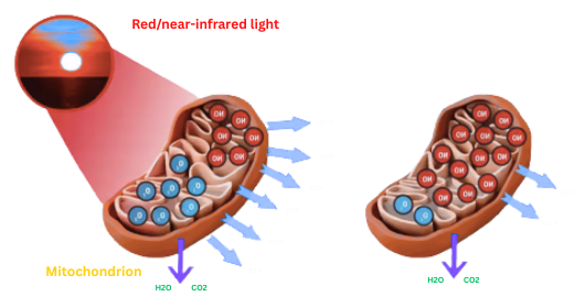 Encouraging ATP generation within the mitochondria by interacting with a light-responsive molecule known as cytochrome c oxidase.